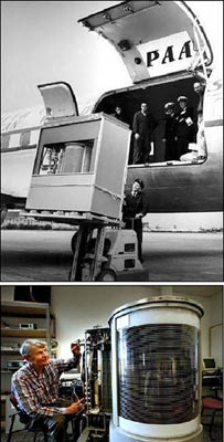 همانطور که در 2 تصوير زير ملاحظه مي کنيد، اين يک هارد کامپيوتر با فضاي ذخيره 5 مگابايت مربوط به سال 1956 ميلادي (55 سال پيش) هست که با پيشرفت هاي روزافزون اخير، اصلا با هاردهاي 500 گيگابايتي که در حال حاضر رايج است قابل مقايسه نيست. اون هارد 5 مگابايتي با اون همه ابهت و عظمت و البته قيمت زياد و تشکيلات خاص براي حمل و نقلش، و هاردهاي ظرفيت بالاي فعلي هم که براحتي در جيب يا يک کيف دستي جا مي شوند ...