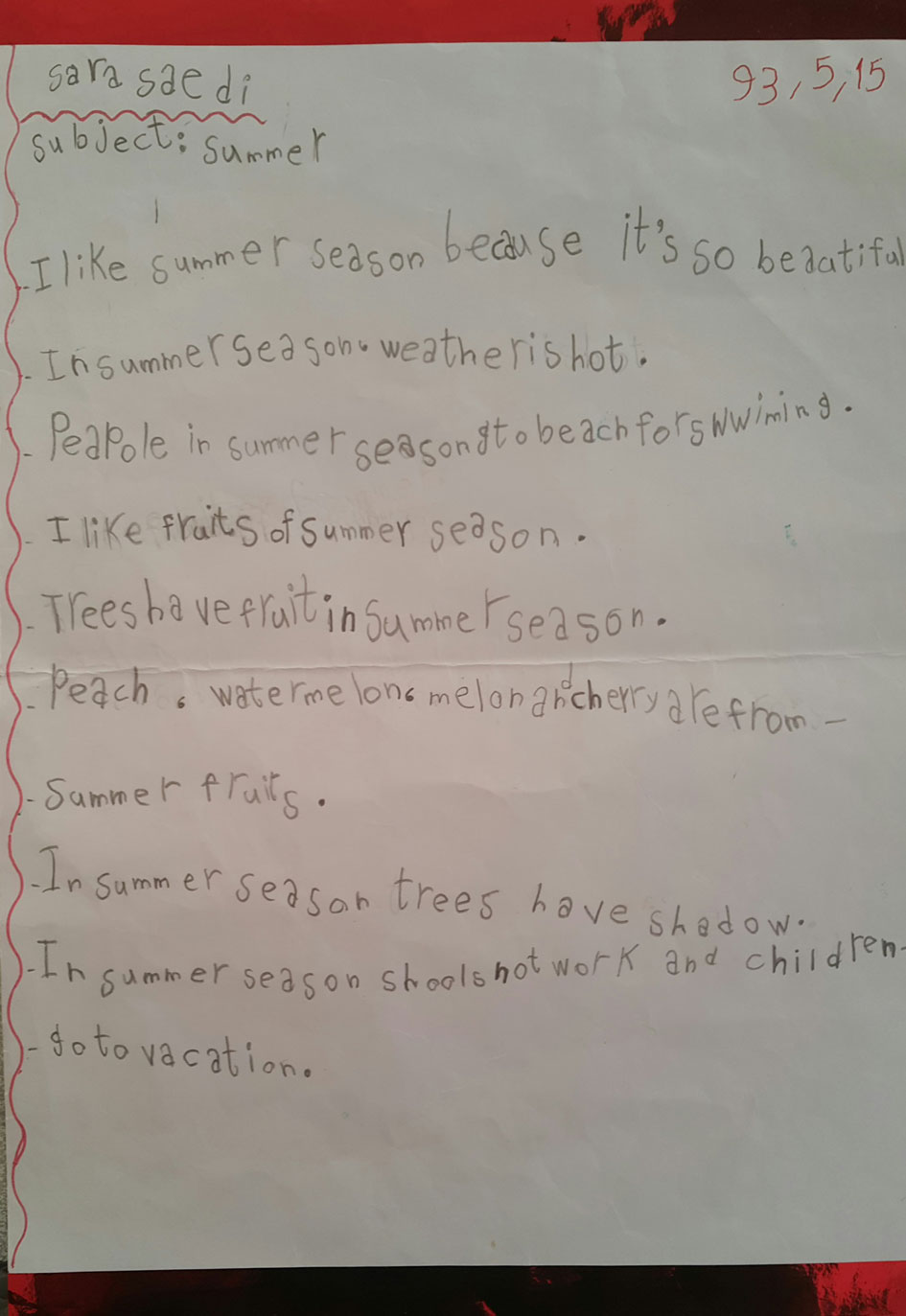 سارا ساعدی، دانشآموز کلاس اول دبستان، متن زیبای انگلیسی زیر را با موضوع تابستان نوشته است.