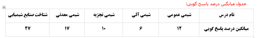 درپایان به داوطلبانی که در دروس شیمی عمومی- شیمی آلی–شیمی تجزیه- شیمی معدنی و شناخت صنایع شیمیایی درصد پاسخگویی کمی داشتند. توصیه میشود برای تقویت دروس خود از کتاب جامع صنایع شیمیایی استفاده کنند.