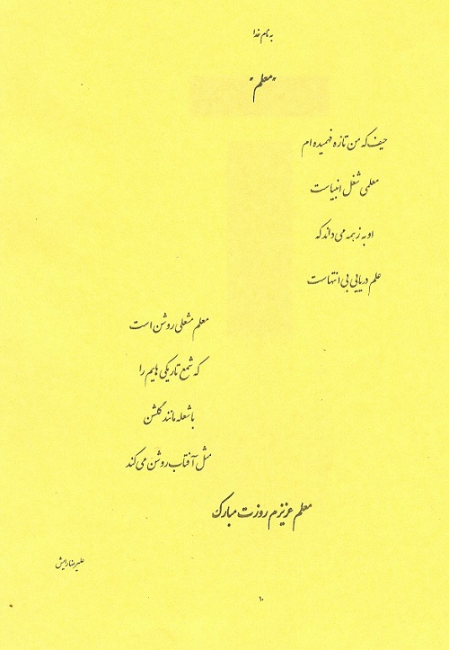 علیرضا زایش از دانشآموزان کانونی شهرکرد این شعر را در وصف مقام معلم سروده است.