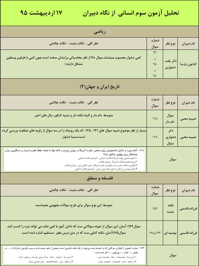 پس از آزمون ، نکات مثبت و چالشی آزمونها را از نگاه دبیران مشاهده فرمایید و شما دانش آموز عزیز میتوانید همراه با تکمیل تحلیل خودتان ، آنها را در کتاب خودآموزی وارد کنید