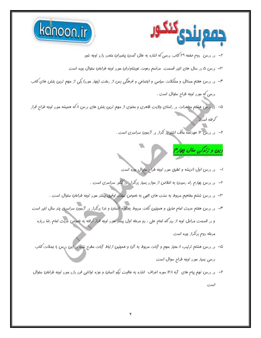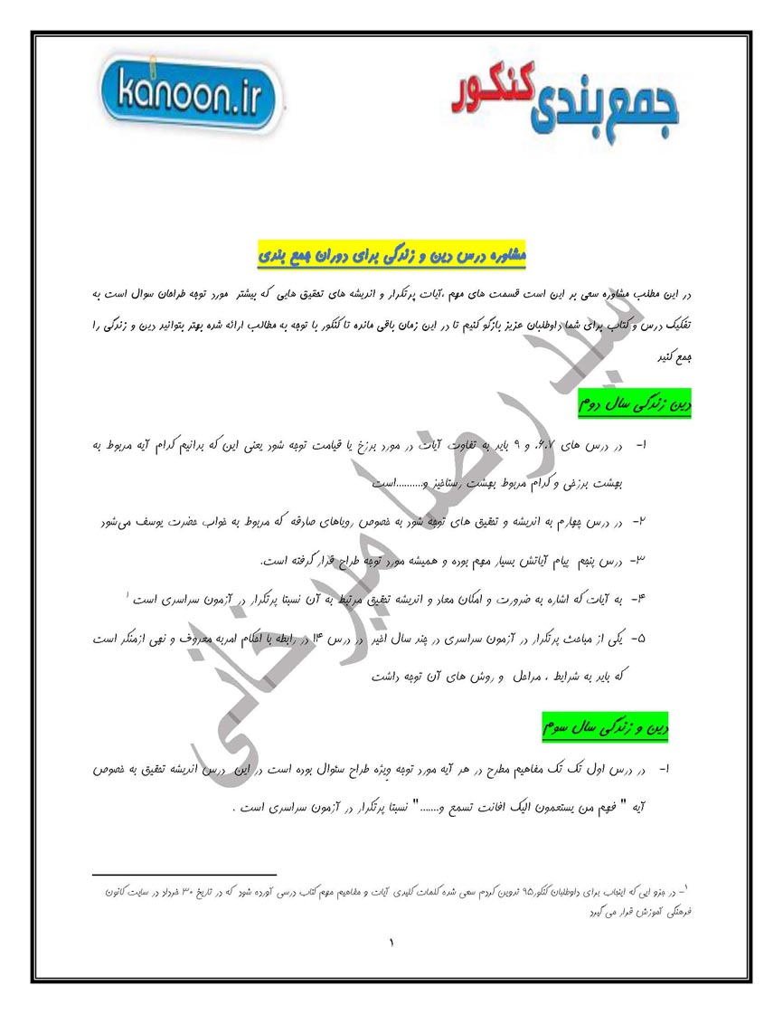 در این مطلب مشاوره سعی بر این است قسمتهای مهم آیات پرتکرار و اندیشهی تحقیق که بیشتر مورد توجه طراحان سؤال است به تفکیک درس و کتاب بازگو شود.