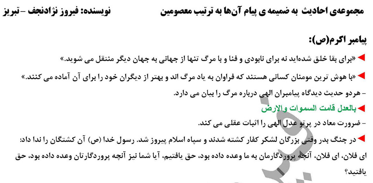 مجموعهی احادیث به ضمیمهی پیام آنها به ترتیب معصومین (ع)