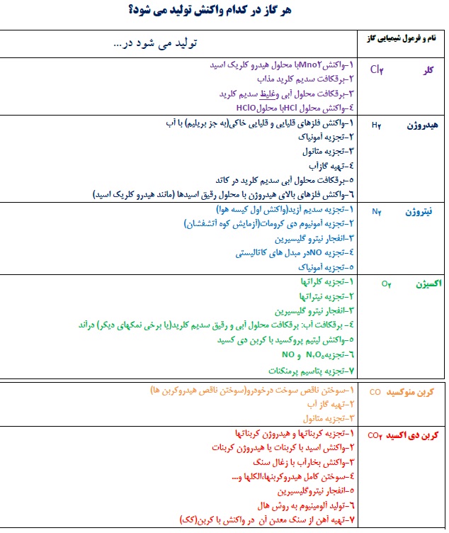 هر گاز در کدام واکنش تولید میشود؟ (شیمی)