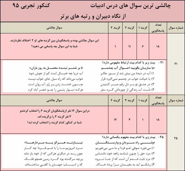براساس کلید های پیشنهادی دبیران و رتبه های برتر برای کنکور تجربی 95 که به سایت کانون ارسال کرده اند ، سوال های زیر چالشی و دام دار تشخیص داده شده اند.