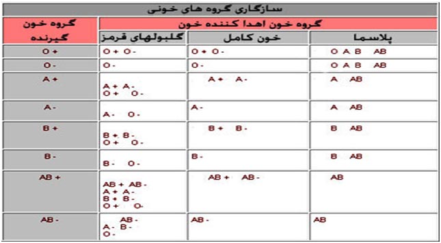 نکته: در دريافت پلاسماي خون شرايط عکس ميشود. يعني گروه AB ميتواند به تمام گروه ها پلاسما اهدا کند، اما گروه O فقط ميتواند به گروه خوني O پلاسما اهدا کند.