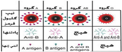 گروه خوني AB:هر دو آنتي ژن هاي A و B روي سطح گلبولهاي قرمز حضور دارد،خون فاقد هرگونه آنتي بادي هاي ضد A و B است.