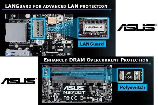 مادربورد N3700T هدرها و کانکتورهای کاملی دارد. یک درگاه miniPCIe با پشتیبانی از mSATA و یک درگاه miniPCIe مجزا برای نصب سایر قطعات سازگار با این رابط، خروجیهای متنوع تصویر HDMI، D-Sub و LVDS برای استفاده در کامپیوترهای یکپارچه، چهار درگاه USB3.0، درگاه استاندارد شبکه RJ45، هدر COM و هدر TPM در این مادربورد بسیار کوچک تعبیه شده است. این مادربورد از فناوریهای محافظتی ایسوس مانند LanGuard و PolySwitch در حافظههای رم استفاده میکنند. علاوه بر این، تمامی ورودی و خروجیها در برابر الکتریسیته ساکن و شوک الکتریکی نیز محافظت میشوند. تمامی خازنهای به کارگرفته شده در مادربورد از نوع جامد بوده و طول عمر 2.5 برابری نسبت به خازنهای رایج دارند.