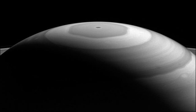 منطقه قطب شمال زحل دارای یک شکل ششگوشه معروف است که گرداب قطبی شمال را محدود میکند. این گرداب به شکل یک لکه تاریک در قطب سیاره به تصویر کشیده شده که به عنوان "چشم توفان" شناخته میشود.