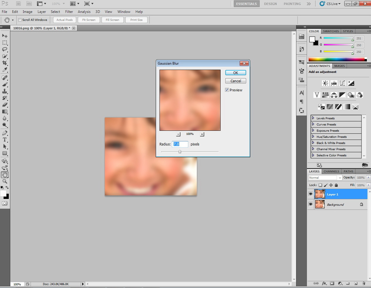 گام دوم: خوب حالا از نوار بالا Filter > Blur > Gaussian Blur رو انتخاب ميکنيم و يک فيلتر به لايه جديدمون ميديم، انتخاب درجه اين فيلتر يکم حساسه و ممکنه تو عکساي مختلف فرق کنه بايد طوري انتخابش کنيم که همه چي محو نشه و چشمها و لبها قابل تشخيص باشه، من براي اين عکس درجه ۷٫۰ انتخاب کردم.