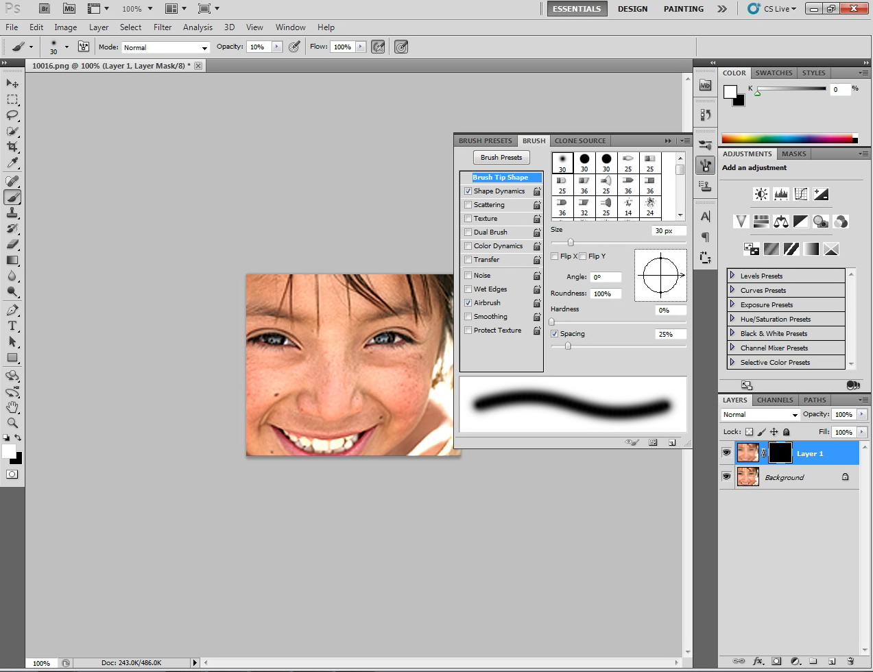 گام چهارم:حالا اول بايد در قسمت جعبه ابزار در قسمت انتخاب رنگ،رنگ Foreground مونو سفيد انتخاب کنيم و در قسمت دوم براي انتخاب Brush از جعبه ابزار بر روي گزينه Brush کنيک ميکنيم(کليد ميانبر:B) حالا در قسمت بالا يک قلم نرم انتخاب ميکنيم و Opacity اونو روي ۱۰% ميزاريم، بروي گزينهToggle The Brush Panelکليک ميکنيم و گزينه Airbrush تيک ميزنيم و در قسمت تنظيمات Hardness:0% ميکنيم.