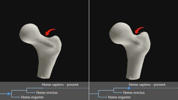 آنها به این نتیجه رسیدند که وقتی راه رفتن چهار دست و پا به راست ایستادن و راه رفتن روی دو پا تکامل یافت، گردن استخوان ران باید پهنتر میشد تا وزن اضافهای را که به آن وارد می شد تحمل کند.
