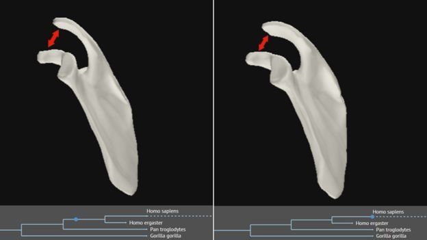 در مورد استخوان شانه محققان متوجه تغییر در اندازه یک شکاف کوچک شدند. تاندونها و رگها از این شکاف عبور میکنند و این شکاف در گذر زمان کوچکتر و کوچکتر شده است.