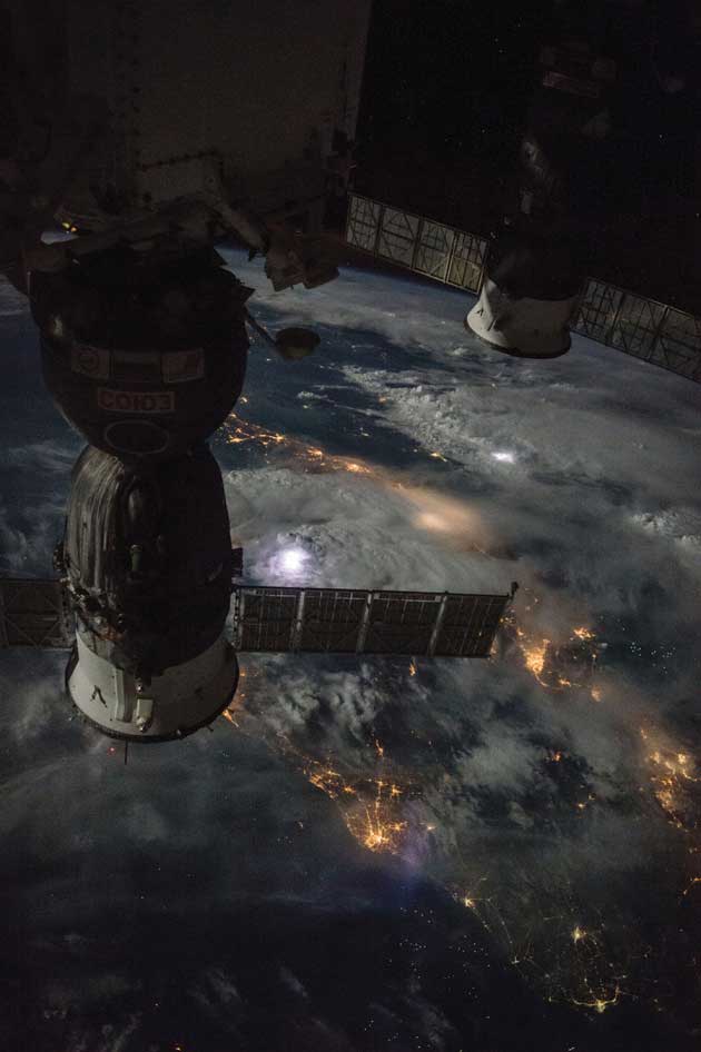 آن سوی ایستگاه بینالمللی فضایی، همانگونه که فعالیت انسان از طریق خوشههای نور آشکار میشوند، نورهای درخشش آذرخش، ابرها را نورانی میکند. دو فضاپیمای روسی که مشغول بازدید از ایستگاه فضایی هستند در زمینه عکس مشاهده میشوند.