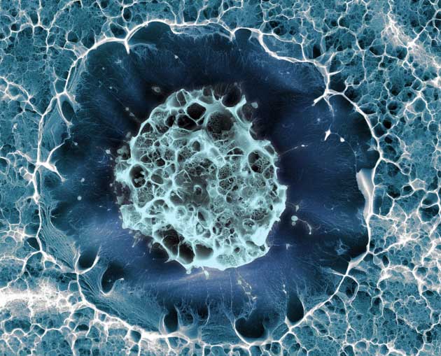 سلول بنیادی انسانی در اطراف تنها 15 میکرومتر است و بعد از تصویربرداری توسط اسکن میکروسکوپیک الکترونی برودتی، رنگ کاذب به خود میگیرد.