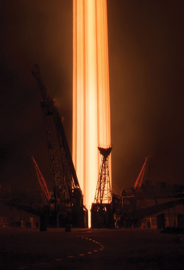 این تصویر آتش متعلق به زمان پرتاب فضاپیمای سایوز از پایگاه فضایی «بایکونور» در قزاقستان است. این فضاپیما حامل سه فضانورد پگی ویتسون آمریکایی، اولگ نوویتسکی اهل روسیه و توماس پسکت فرانسوی به ایستگاه بینالمللی فضایی بود.