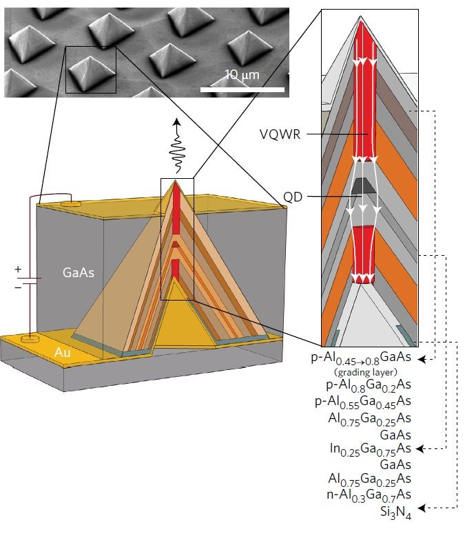 این گروه با معکوس کردن ساختار هرمی، میزان خروج نور را چند برابر افزایش دادند. ایجاد تماس میان نوک و کف این ساختار میتواند جریان را به یک نقطه کوانتومی انتقال دهد؛ نقطهای که در مرکز هرم قرار دارد. این ساختار دارای قابلیت تولید انبوه است.