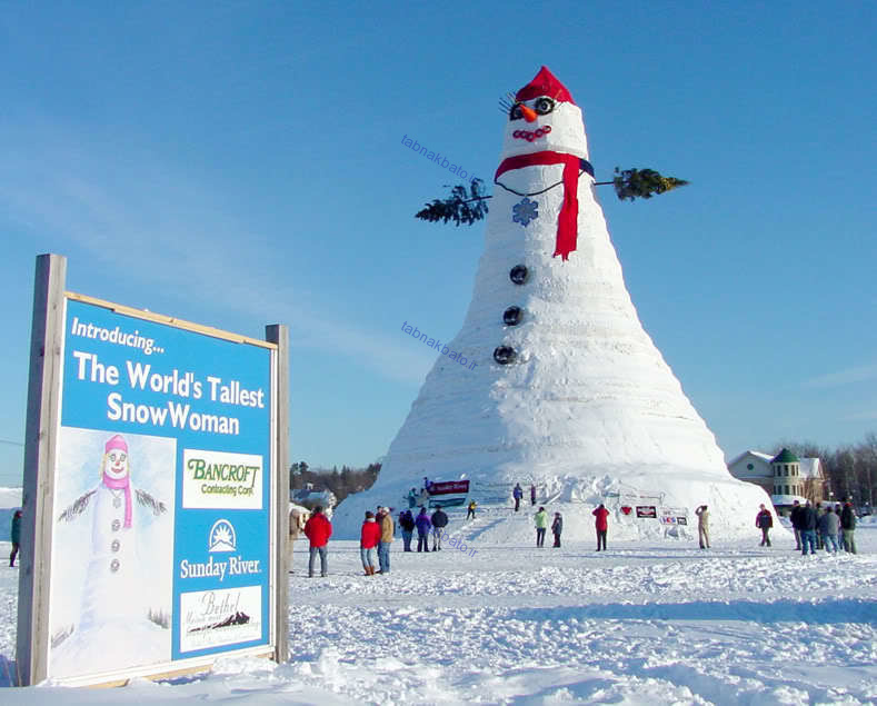 ۴. بزرگترین آدم برفی جهان در فوریه ۱۹۹۹ میلادی و در ایالت «مین» آمریکا و با ارتفاع ۳۴ متر ساخته شد.