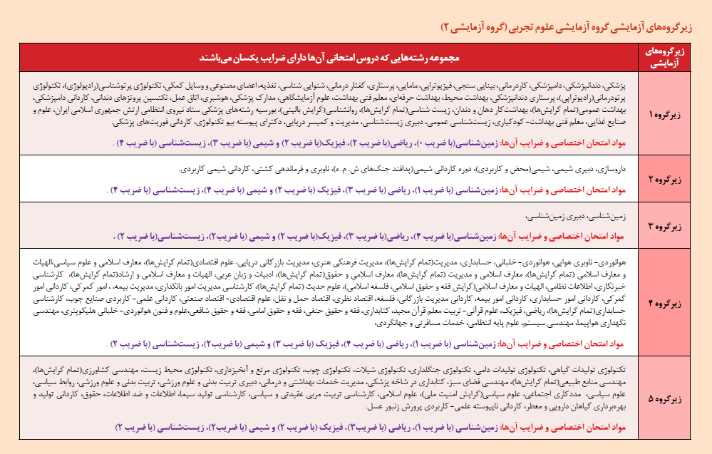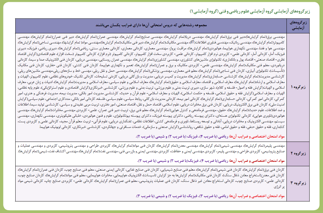 کنکور | مواد امتحانی | ضرایب دروس به تفکیک زیر گروه های آزمایشی | ||||