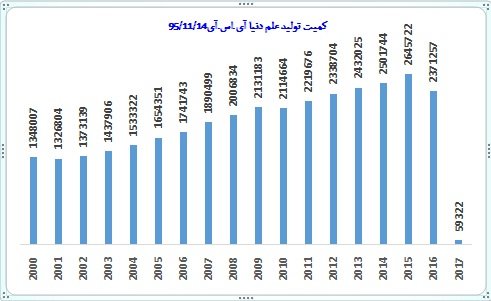 تولید علم دنیا در اسکوپوس در سال ۲۰۱۵ نسبت به سال ۲۰۱۴ حدود ۴ درصد رشد منفی را نشان میدهد که این واقعیت در خصوص پایگاه آی.اس.آی صادق نیست که میتواند متاثر از سیاستهای نمایهسازی این پایگاه باشد. مقایسه سال ۲۰۱۵ و ۲۰۱۴ میلادی در آی.اس.آی نشان میدهد که کمیت علم دنیا حدود ۶ درصد رشد داشته است.