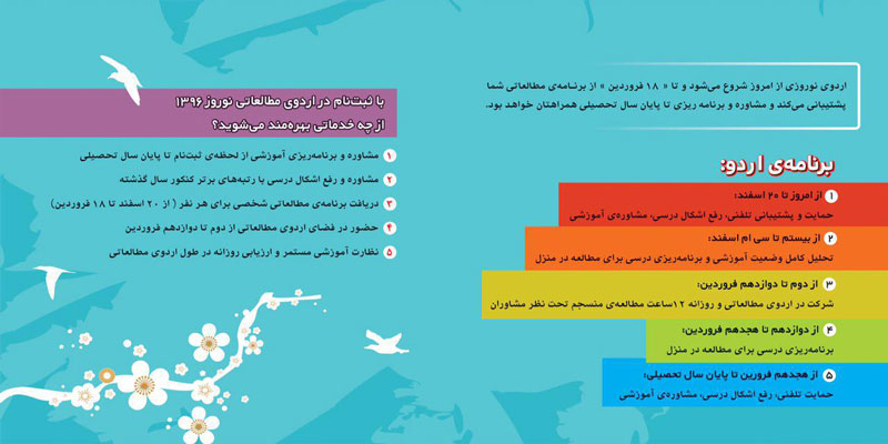 در فاصله ی آزمونهای ششم و بیستم اسفندماه و پس از بیستم اسفندماه برای دانش آموزانی که با تأخیر ثبت نام کرده اند، جلسه ی مشاوره و برنامه ریزی اردوی نوروزی بین دانش آموز و مشاور آموزشی برگزار میشود. در این جلسه موارد زیر انجام می شود: