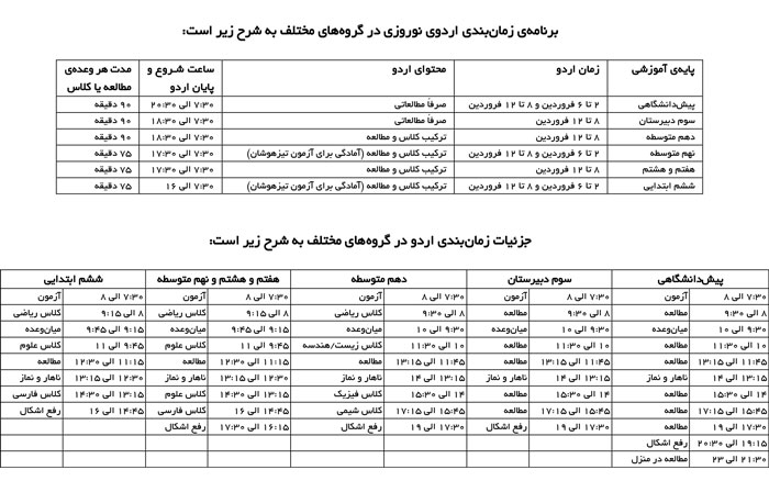 برای دانش آموزان پیش دانشگاهی و سال سوم که اردوی نوروزی آنها به صورت صرفاً مطالعاتی برگزار می شود در فاصله ی 25 تا 30 اسفند قبل از شروع اردو همایش های آموزشی برای پیش آمادگی مطالعاتی و زمینه سازی برای حداکثر پیشرفت درسی برگزار خواهد شد.
