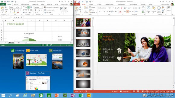 ویندوز جدید این امکان را میدهد که بهصورت همزمان از 4 نرمافزار استفاده کنید و تمام آنها را بهصورت کامل مشاهده نمایید.در این طرح جدید، صفحه به یک مربع تقسیم میشود. ویندوز جدید همچنین نرمافزارهایی که بهطور پنهان در حال فعالیت میباشند را به کاربر اطلاع میدهد و حتی بهطور هوشمند پیشنهادهایی باکار در حال انجام کاربر برای استفاده از نرمافزارها و پر کردن فضای خالی صفحه ارائه میکند.