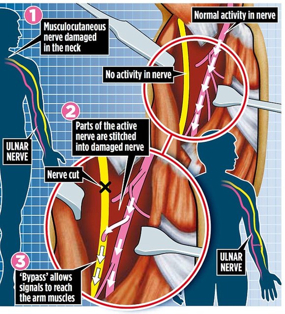 جراحان در این روش ، شاخه ای از عصب اولنار در بازو را به عصب عضلانی متصل کرده و اجازه میدهند تا سیگنالها منطقه آسیب دیده را میانبر بزنند.