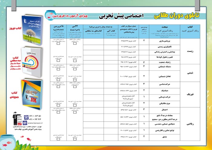 اگر تابلو نوروزی را تکمیل کنید به صورت عملی این کار را انجام خواهید داد. ستون اول تابلو نوروزی مربوط به درس است. رنگ آمیزی باید با رنگ های کانون آبی و سبز و زرد و قرمز انجام شود. در ضمن مقایسه شما باید نسبت به همترازهای خودتان باشد. می توانید برای زرنگ آمیزی ستون اول هم از نمره درس هایتان در مدرسه استفاده کنید یا براساس آزمون های کانون انجام دهید. دانش آموزان مدرسه هم همین طور. ستون دوم مربوط به مباحث است. شما ممکن است در مبحثی خوب کار کرده باشید ولی در مبحثی نیاز به تلاش بیشتر دارید با رنگ آمیزی در یک نگاه شما به راحتی متوجه نقاط قوت و ضعف خودتان می شوید.