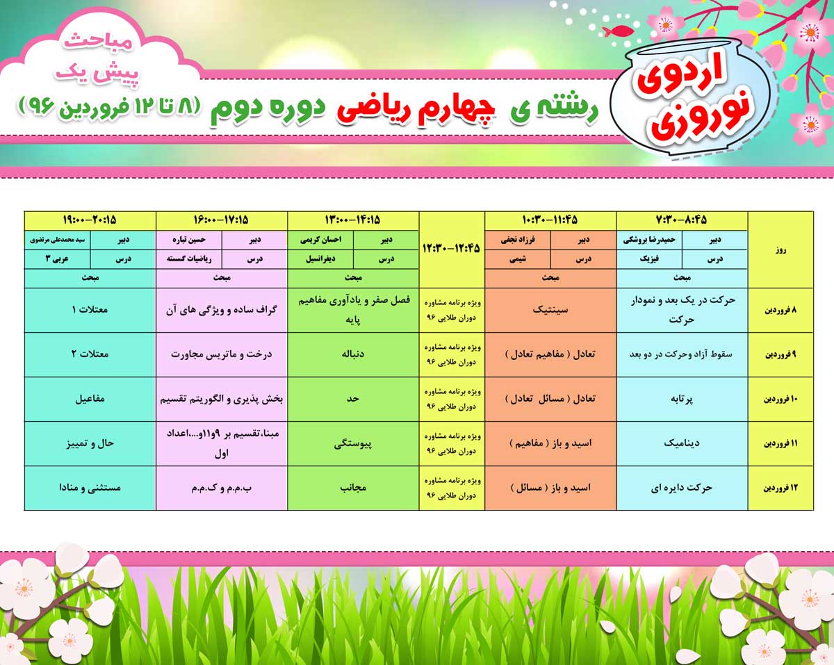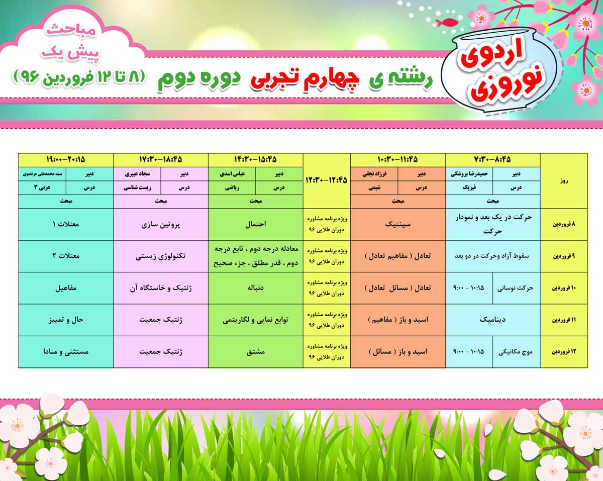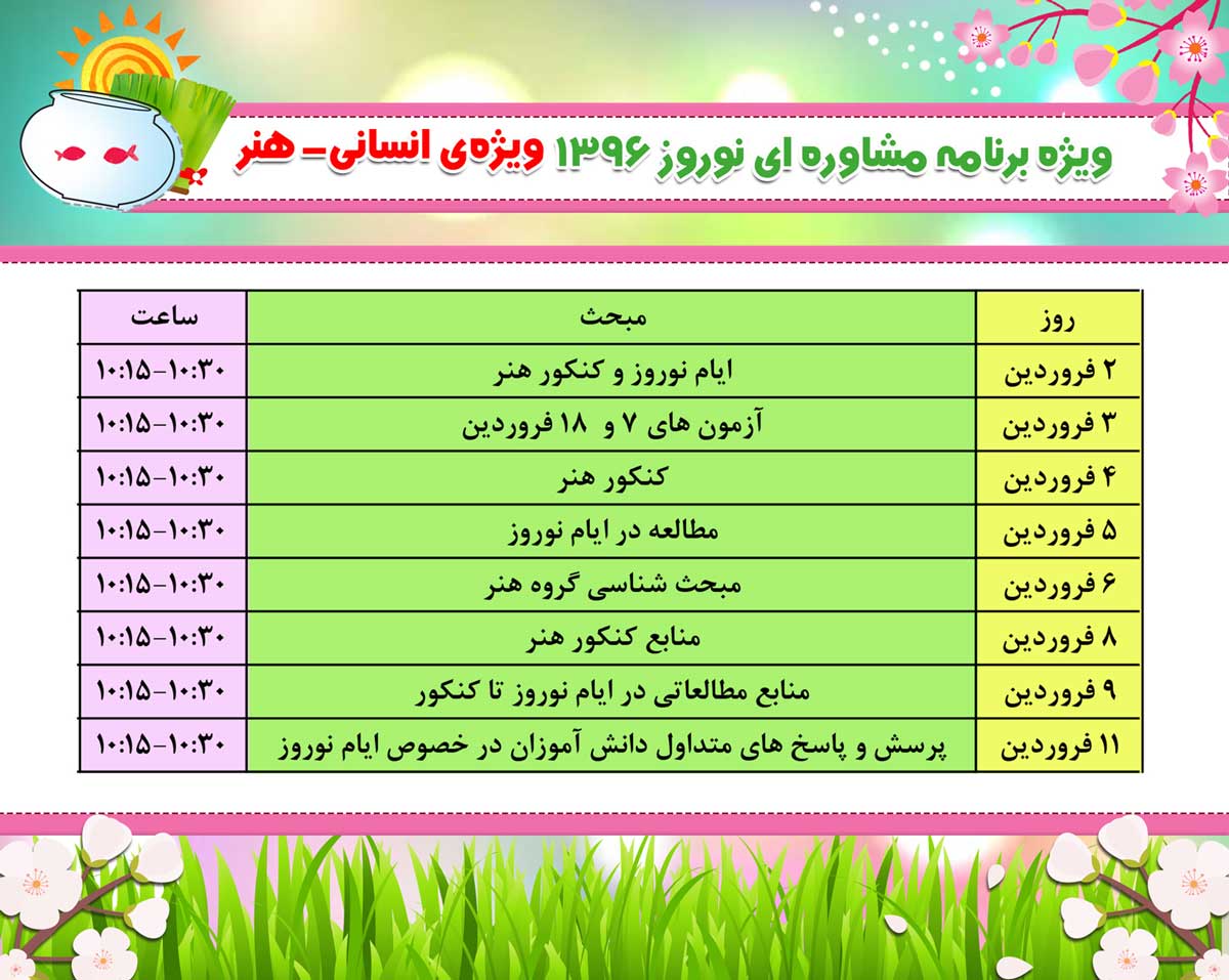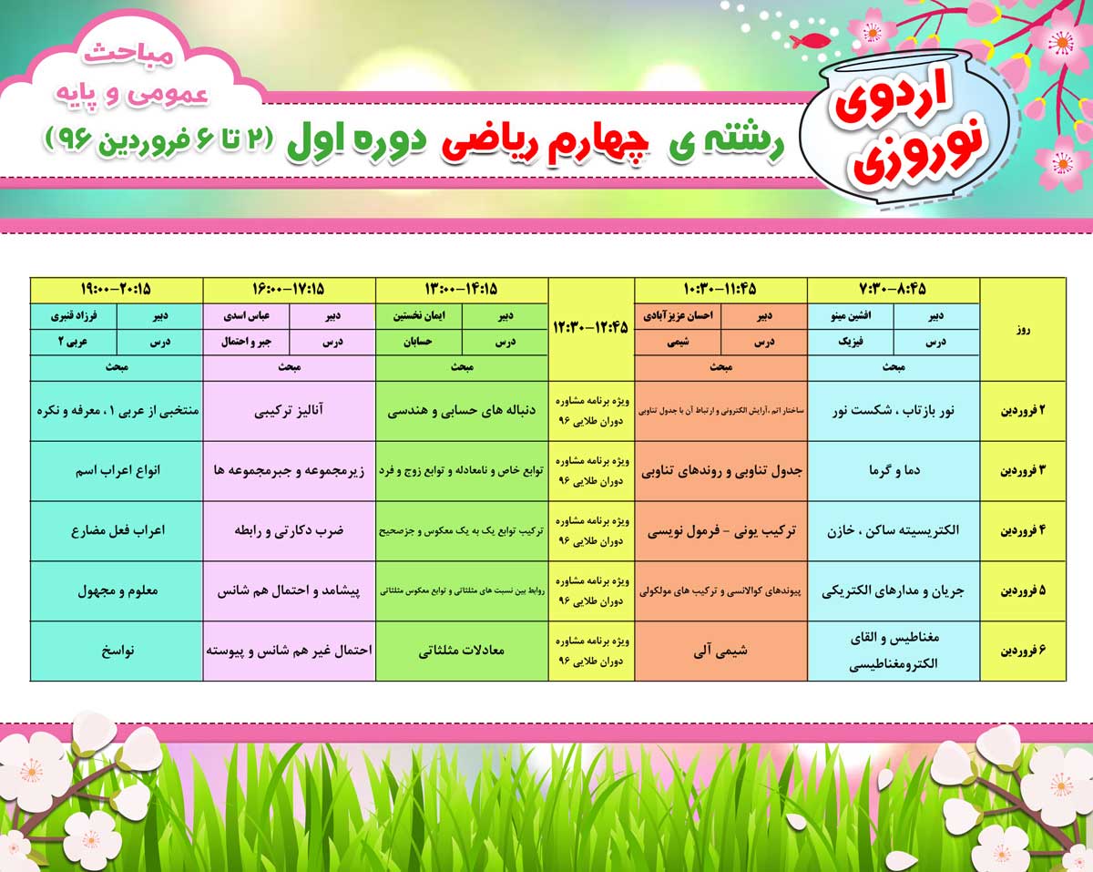 کلاس های نوروزی آنلاین در فروردین 96 به صورت رایگان از طریق سایت کانون برگزار می شود.برای مشاهده برنامه و بازپخش فیلم ها اینجا کلیک کنیدبرنامه کلاس ها را در ادامه مشاهده کنید.