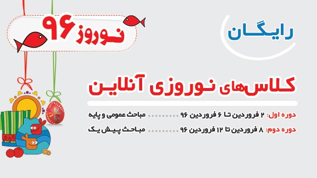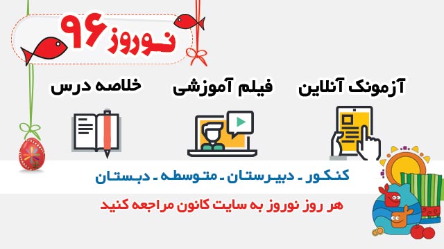نوروز 96 با سایت کانون همراه باشید ... در نوروز امسال با کلاس های آنلاین ، فیلم های آموزشی ، خلاصه درس و آزمونک های آنلاین برای تمامی مقاطع و گروه ها همراه شما خواهیم بود .
