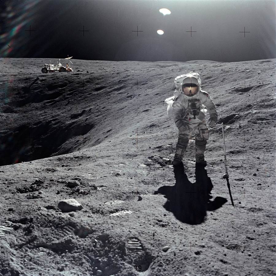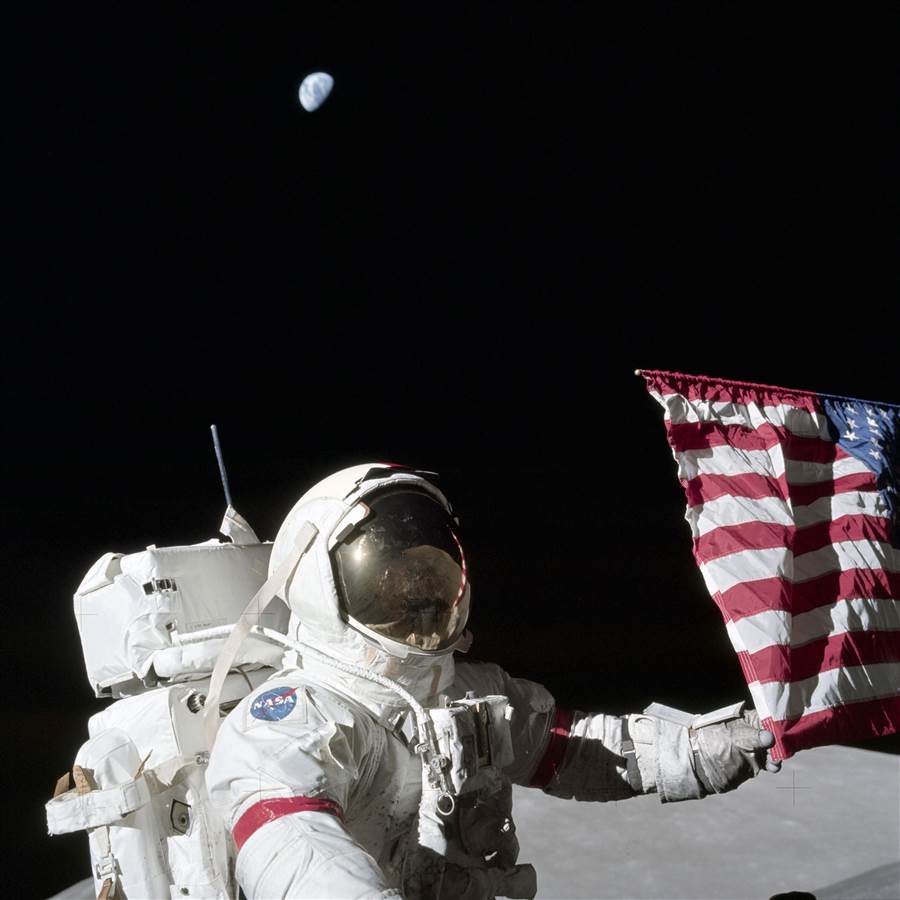 اوگن سرنان در این عکس که در نخستین پیاده روی روی ماه در عملیات آپولوی 17 گرفته شده، گوشه پرچم آمریکا را در دست نگه داشته است. او آخرین انسانی بود که روی ماه راه رفت و قبل از آنکه به نردبان فضاپیما برسد، حروف نام تنها فرزندش را روی خاک ماه ترسیم کرد. او در 16 ژانویه 2017 (27 دی ماه 1395) در تگزاس درگذشت.