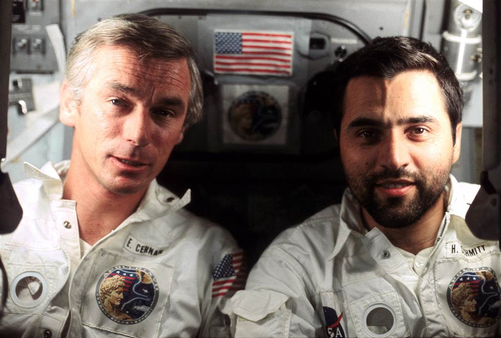 وگن سرنان، سمت چپ و هریسون اشمیت سمت راست در فضاپیمای آپولوی 17 که در سال 1972 آخرین فرود انسان روی ماه را انجام داد. اشمیت نخستین کسی بود که بهعنوان دانشمند (زمینشناس) به ناسا جذب شد و به فضا سفر کرد. گروهی که او از بین آنها انتخاب شد، نخستین دانشمند-فضانوردان تاریخ را تشکیل دادند و برای نخستینبار از میان خلبانهای سابق انتخاب نشده بودند.