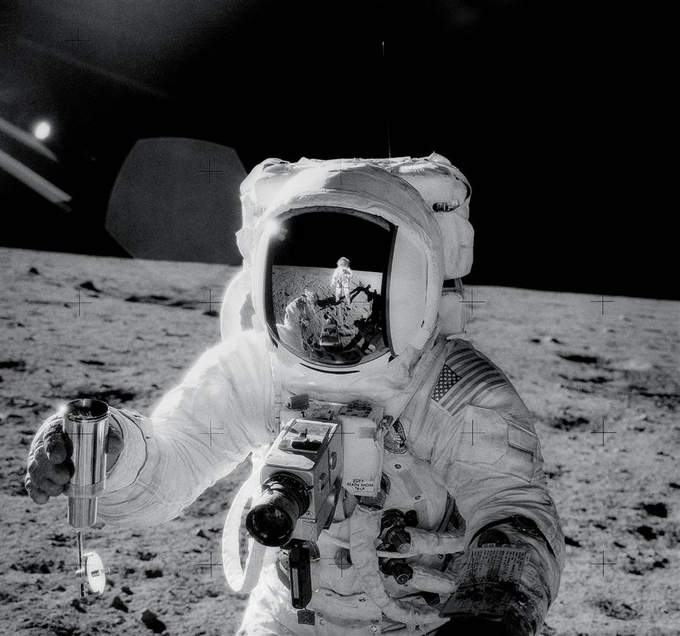 «باز آلدرین»، دومین انسان روی کره ماه بود که پس از آرمسترانگ پیاده شد. در این تصویر او در کنار یکی از تجهیزات ماه به نام «ایگل» دیده میشود و در انعکاس روی کلاهخود نیز، تصویر آرمسترانگ که در حال عکاسی است قابل دیدن است.