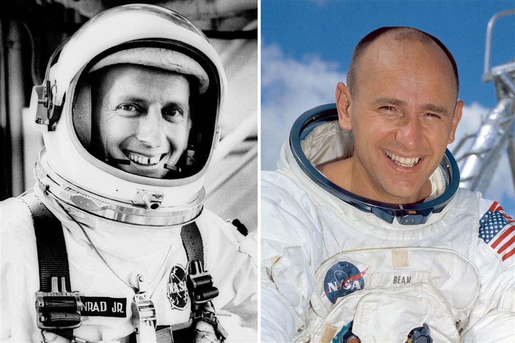 «چارلز کنراد»، سومین مردی بود که روی ماه پیاده شد. عکس سمت چپ مربوط به نخستین سفر فضایی او در سال 1965 و با فضاپیمای گیمی5 است. در تصویر سمت راست، او قبل از سفر به ماه دیده میشود. وی در سال 1999 در سن 69 سالگی در اثر سانحه موتورسیکلت در کالیفرنیا جان باخت. کنراد در سال 1981 از ناسا استعفا داد تا در خلوت خود به نقاشی بپردازد.