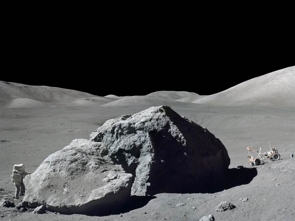 هرسیون اشمیت در کنار یک تختهسنگ بزرگ روی ماه در حال پیادهرویست. او به همراه اوگن سرنان، دو فضانوردی بودند که طی سومین عملیات آپولوی 17، در دسامبر 1972 (دی ماه 1351) روی ماه فرود آمدند.