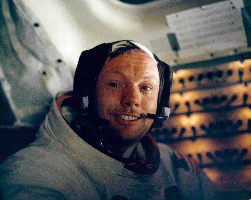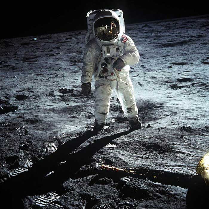 تصویر آرمسترانگ در ماهنوردی که روی این کره حرکت کرد. او پس از پیادهشدن از سفینه گفت: «این قدمی کوچک برای یک مرد و اما گامی بزرگ برای بشریت است».