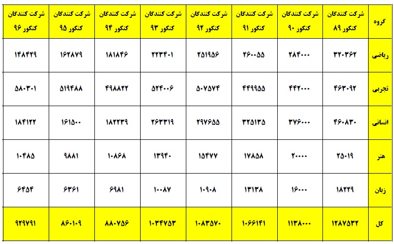 در جدول زیر آمار شرکت کنندگان کنکور از سال 89 تا 96 را مشاهده کنید.