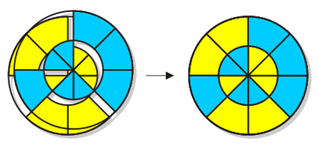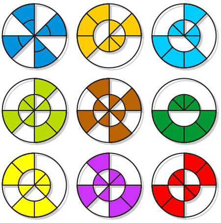 در شکل بالا، 9 دایره داریم که هر یک بصورتی، قطعه بندی و رنگ آمیزی شده اند. آیا می توانید دو شکل مکمل هم را بیابید؟ منظور از مکمل، شکل هایی هستند که اگر بر هم منطبق شوند، بدون همپوشانی رنگها بر روی یکدیگر، سطح کل شکل، رنگ شود.