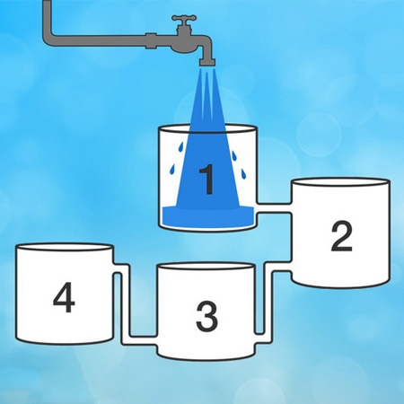 چهار ظرف آب داریم که به هم متصل هستند. شیر آب را باز می کنیم. آب با فشار ملایم درون ظرف اول می ریزد. آیا می توانید بگویید کدام ظرف قبل از بقیه، بصورت کامل پر خواهد شد؟