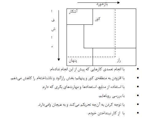 وقتی به من بازخورد میدهید، اطلاعاتی هم در مورد خودتان به من میدهید که نشان میدهد شکل بازخوردتان چگونه است و چطور با رفتارم، واکنشی را در شما برانگیختهام. بدین ترتیب از منطقهی پنهان یا کورتان، با گفتن یا انجام برخی کارها که خارج از این منطقه قرار دارد، میکاهید. به همین ترتیب که با توجه من به بازخوردتان، از منطقهی کورتان میکاهید و به منطقهی آشکارتان به کمک من میافزایید.