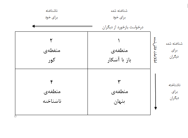 3. منطقهی پنهان: آن چه فرد دربارهی خودش میداند، اما دیگران چیزی از آن نمیدانند. این بخش «نمای بیرونی فرد» هم نامیده میشود.