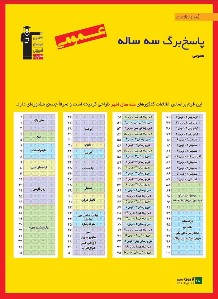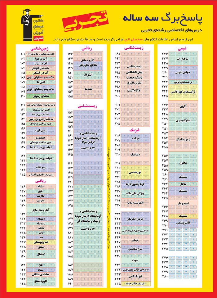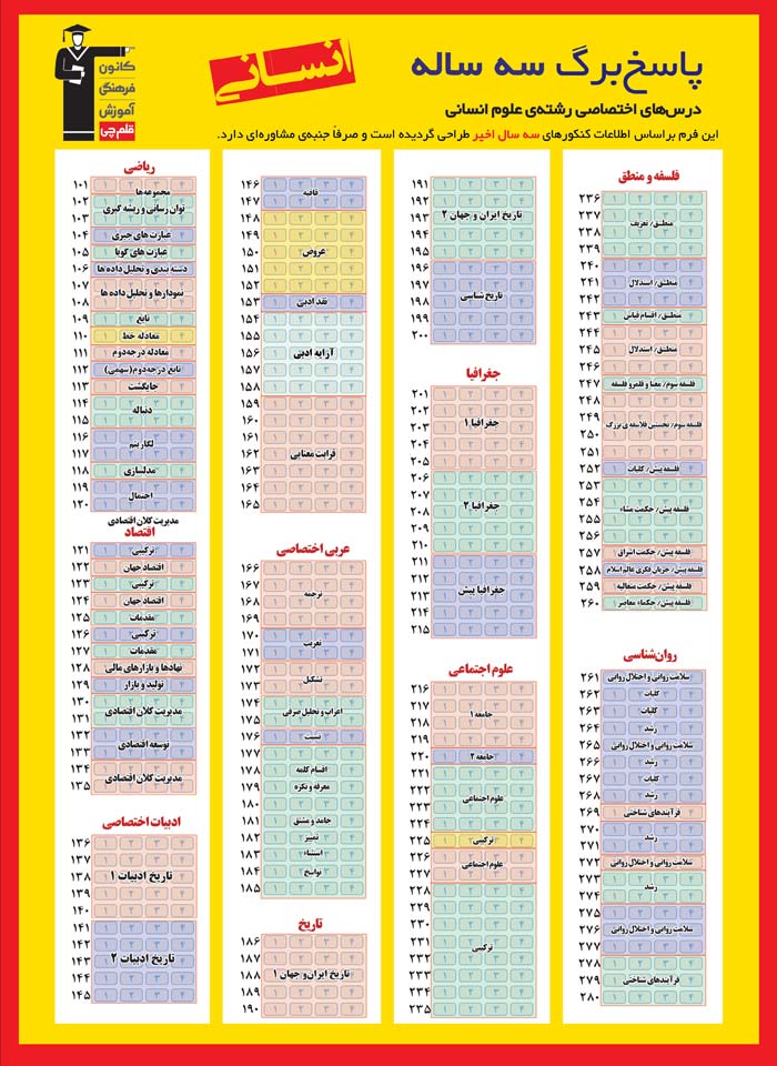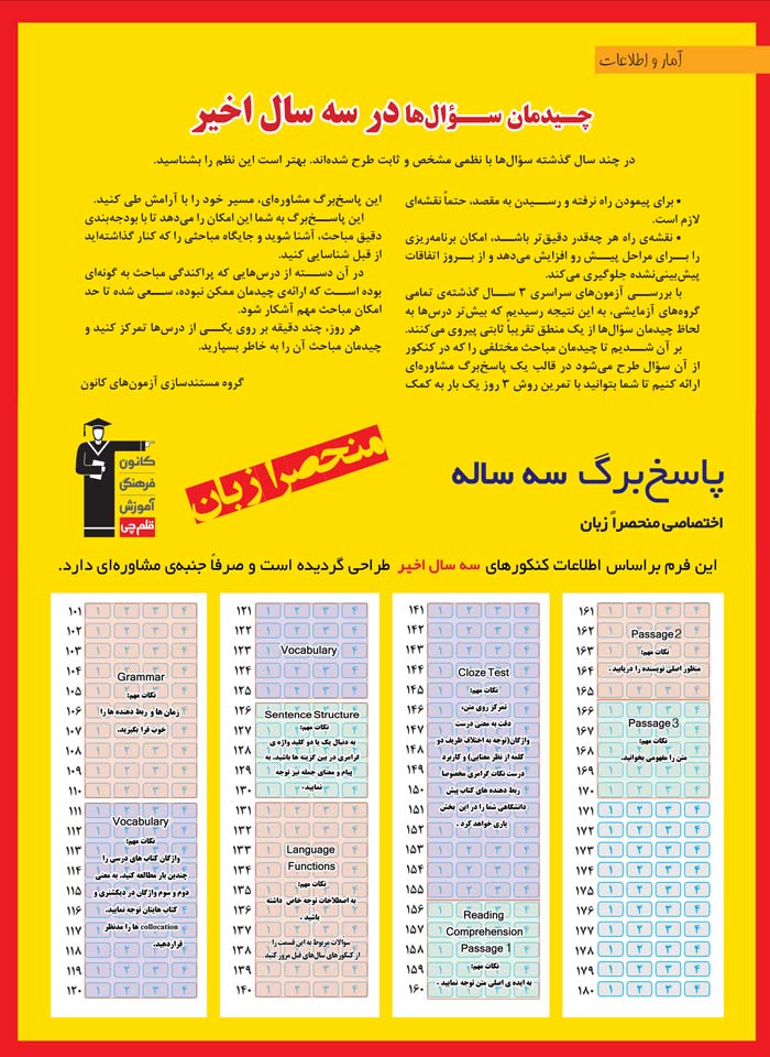 آنگاه بر آن شدیم تا چیدمان مباحث مختلفی را که در کنکور از آن سؤال مطرح میشود شناسایی کرده و در قالب یک پاسخبرگ مشاورهای ارائه کنیم تا شما بتوانید با تمرین 3روز یکبار به کمک این پاسخبرگ مشاورهای، مسیر خود را با آرامش طی کنید.