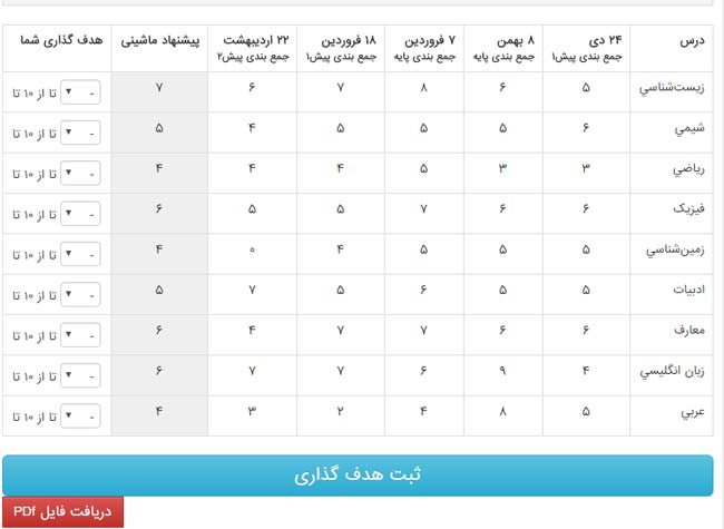 * جدول هدف گذاری را در صفحه ی شخصی خود ببینید .نتایج پنج آزمون جامع و پیشنهاد ماشینی برای هدف گذاری را در یک نگاه می بینید . این پیشنهاد بر اساس میانگین عملکرد چند از ۱۰ خود شما ارائه می شود .