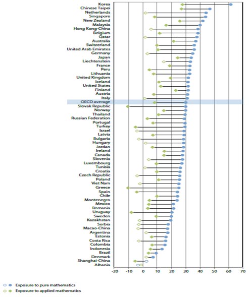 آموزگاران ریاضیات اغلب در پاسخ به این پرسش که «آیا در مدارس، تدریس ریاضیات محض مهمتر است یا ریاضیات کاربردی؟» توافق ندارند. در تدریس محض یا رسمی، مفاهیم ریاضی روی قواعد ریاضی که مجزا از جهان پیرامون ما هستند (انتزاعی هستند) تمرکز دارد و اغلب روی معادلات یا فرمولها تاکید میشود. از سوی دیگر، در ریاضیات کاربردی، به کسانی که تعلیم میبینند این امکان داده میشود که مفاهیم ریاضی و مدلها را در حل مسایل جهان واقعی به کار برند. این ریاضیاتی است که عمدتا در شاخههای مختلف علوم، مهندسی و فناوری مورد استفاده قرار میگیرد. در سراسر جهان، برنامه درسی ریاضی در هر کشوری نسبت به این که دانشآموزان تا چه میزان نسبت به انواع مختلف ریاضی عمل میکنند، تفاوت دارد. شکل 1 نشان میدهد که تفاوتهای زیادی میان کشورهای مختلف از نظر تدریس ریاضیات محض و کاربردی در مدارس وجود دارد. در این نمودار کشورها بر اساس دو شاخص قرارگیری در معرض ریاضیات محض و کاربردی نسبت به متوسط کشورهای عضو OECD نمایش داده شدهاند. همانطور که در نمودار میتوان دید در اغلب کشورها از هر دو روش در تدریس همزمان استفاده شده است، هر چند شدت استفاده از روشهای بین کشورهای مختلف تفاوت زیادی دارد. سوال مهمی که باید در این تفاوتها بررسی شود این است که کدام یک از این نوع روشهای تدریس باعث اخذ نمرات بهتر در آزمون استانداردی مانند پیزا میشود. چنین سوالی را در بخش بعدی این نوشته پاسخ خواهیم داد.