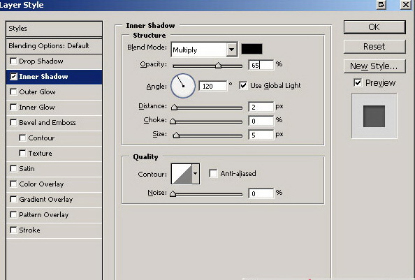۱۲- براي اينکه يه حالي به طرح داده باشيم تا حال و هواش يه کم بهتر بشه ميتونيد يه inner shadow هم بهش اضافه کنيد. روي لايه دابل کليک کنيد و blending options رو بزنيد و از سمت چپ inner shadow رو انتخاب کنيد و تنظيمات زير رو قرار بديد:
