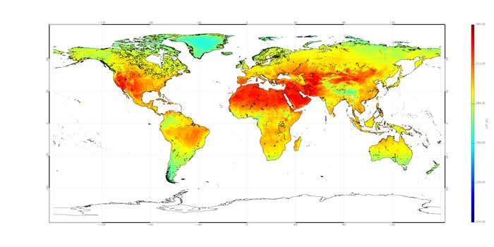 افزون بر این، حسگر دمای سطح خشکی و دریای ماهواره آژانس فضایی اروپا انرژی تشعشع شده از سطح زمین را اندازه میگیرد. تصویر پایین تغییرات دمای خشکیهای زمین بین ماههای ژوئیه و نوامبر سال 2016 را نمایش میدهد.