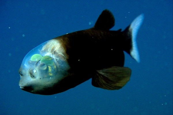 این ماهی که 72 سال پیش در کالیفرنیا با طول 15 سانتیمتری کشف شده، گونهای نادر و تخمگذار با لارو پلانکتونیک است. این ماهی در محیطهای دریایی عمیق آرام شمالی زندگی میکند و دارای بالچه چربی، سر بزرگ و نورانی، چشمان لولهای چرخان با قدرت دید بالاست. کرههای سبز رنگ چشمهای این ماهی هستند که رو به بالا قرار گرفتهاند تا بتواند با کمک سر شفافش، شکارهای خود را در تاریکی آبها ببیند.
