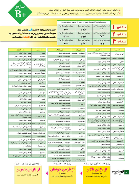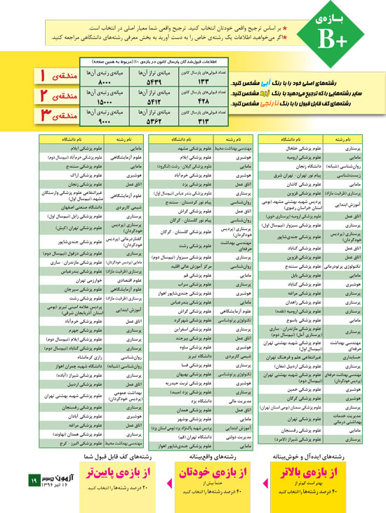 در این قسمت رشته/محلهای بازهی B+ را برای شما قرار دادهایم. شما میتوانید برای آشنایی با سایر بازههای رشتهی تجربی مجلهی آزمون شمارهی 335 را از نمایندگیهای کانون (آدرس نمایندگیها) یا سایت کتاب کانون تهیه کنید.
