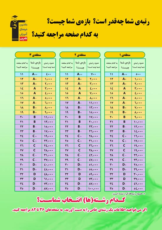 در قسمت پایین، جدول بازهها را ميبينيد و اين بازهها با حروف لاتين از ++A تا –D مرتب شدهاند. پس از دريافت كارنامهي سراسري یا بر اساس تراز آزمونهای کانون، جايگاه خود را انتخاب كنيد. اين جدول بر اساس رتبهي شما در كنكور سراسري مرتب شده است.